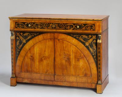 Késő empire és biedermeier stílusjegyeket hordozó, fekvő hasáb alakú szekrény, kétajtós homloklapja fölött egyetlen széles fiókkal. Elöl kétoldalt faragott és aranyozott levéldíszes talapzatból induló, felfelé szélesedő, festett girlandokkal díszített, fent női büsztben végződő pilaszterek fogják közre. A két ajtószárny felületének legnagyobb részét összefüggő, félköríves keretezésű, mélyített betétmező alkotja, a felettük elhelyezkedő ívháromszögeket tussal festett növényi ornamentika tölti ki. A fölöttük húzódó fiók homloklapján, tükrösen szimmetrikus elrendezésben, a középen elhelyezkedő (jelenleg hiányzó) kulcslyukpajzs fölé virágos urnát tartó nőalakok, kétoldalt az alanti ajtószárnyak díszítéséhez hasonló indás-leveles motívumok láthatóak – a tekeredő indákhoz igazodva felerősített, rézből öntött húzógombokkal. Tetejét enyhén előreugró párkányzatot alkotó, díszítés nélküli, szögletes fedőlap zárja le.