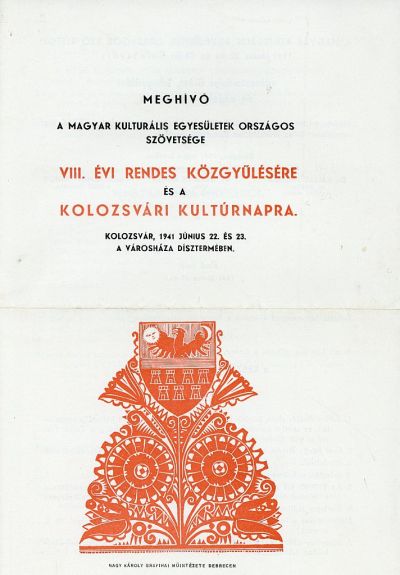 Alkalmi grafika - Meghívó: M. Kult. Egyesületek Orsz. Szöv. VIII. évi rendes közgy. és Kolozsvári Kultúrnap