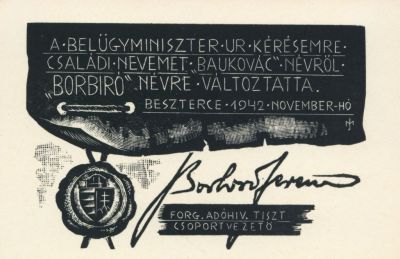 Alkalmi grafika - Névváltoztatásról értesítés: Baukovác névről Borbíró névre változtatta…