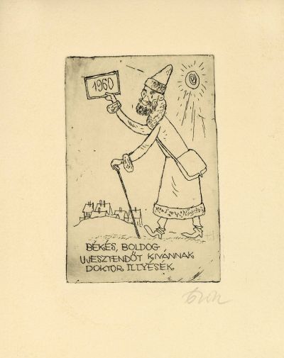 Alkalmi grafika - Újévi üdvözlet: Békés, boldog újesztendőt kívánnak doktor Illyésék