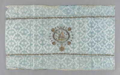 Anyag: | aranyszínű fémfonal; ezüstszínű fémfonal; selyemdamaszt; selyemfonal |