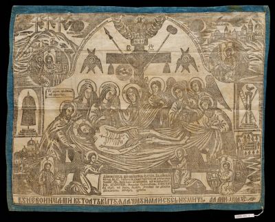 Az Iparművészeti Múzeum példányán, a vászonra nyomott fametszet kompozícióban Szűz Mária kitárt karokkal siratja halott fiát, akit az Arimáteai József és Nikodémus által tartott lepelre helyeztek. A Szent Szűz két oldalán Márta, Mária Magdolna, János apostol és angyalok társulnak a siratáshoz, a középtengelyben álló kereszt fölött az Atya áldó alakja, a kereszt jobb szára alatt pedig a Szentlélek jelképe, a galamb is föltűnik. A központi ikon sarkain az evangélisták medalionba helyezett képei jelennek meg, a háttérben a Kálvária, Jeruzsálem látképe, a Jeruzsálemi templom, illetve a Szentsír látható. A kereszt két oldalán és a kompozíció rövidebb oldalain a szenvedésre utaló eszközök (lándzsa, szivacs, bíborköpeny, létra, kakas stb.) szerepelnek. A szentek nimbuszaiban a neveik, az ikon körül román liturgikus szövegek egészítik ki az ábrázolást. A kompozíció alatti román feliratból tudható, hogy Dioniszie Novákovics budai és erdélyi ortodox püspök szentelte meg 1761-ben ezt az antimenziont.