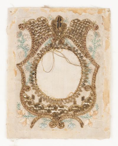 Anyag: | aranyszínű bouillon; aranyszínű lamella; selyemfonal; selyemszövet; vászon |