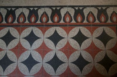 Épületfotó - a Deutsch-ház (Szeged, Dózsa György utca 2.) cementlap padlóburkolata a bal oldali lépcsőház egyik fordulójában