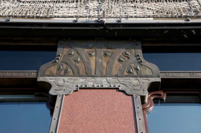 Épületfotó - a Gresham-palota (Budapest, Széchenyi István tér 5.) főhomlokzata – a földszinti üveges portálok szélesebb rézkeretes pilaszterének fejezete