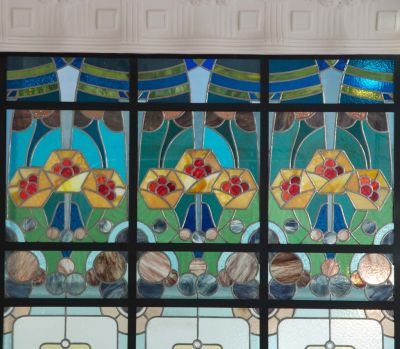 Épületfotó - a Gresham-palota (Budapest, Széchenyi István tér 5.) Kossuth-lépcsőjének záró szintje – a színes üvegtető részlete