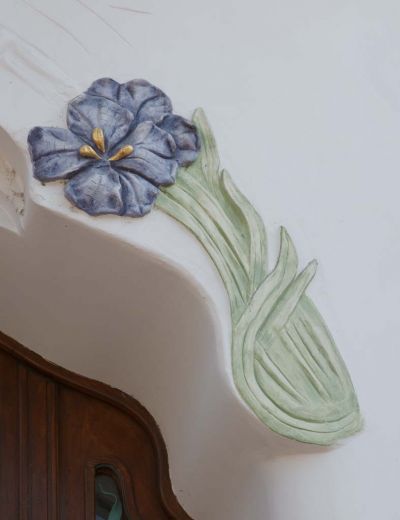 Épületfotó - a Reök-ház (Szeged, Tisza Lajos krt. 56.) főkapuját keretező stukkódísz