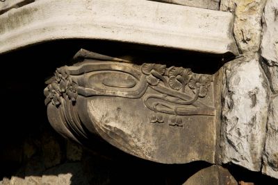Épületfotó - a Vidor-ház (Budapest, Városligeti fasor 33.) főhomlokzata – a földszinti egykori zeneszoba erkélyét tartó konzol