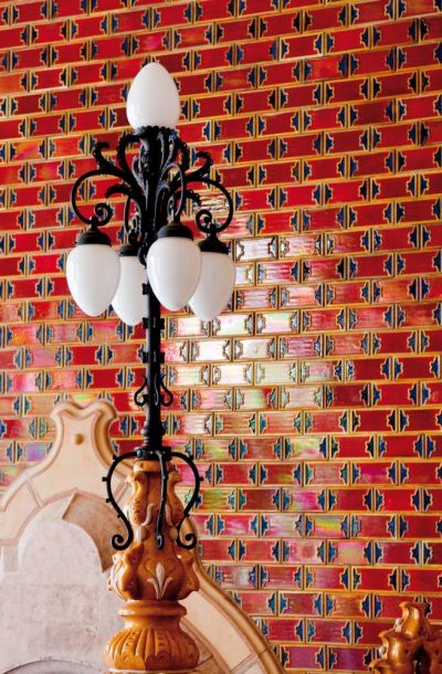 Épületfotó - az Iparművészeti Múzeum nyitott előcsarnokának Zsolnay kerámia borítású oldalfala