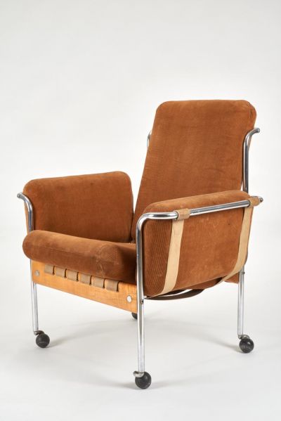 E két megoldással, modul-méretben szabott elemekkel a bútorok nagy családja építhető ki, gazdaságos gyártási feltételek mellett. A bemutatott két tárgy a tervező által szerkesztett bolygókerekeken mozog. A fémelemek krómozással, a farészek natúr dörzsölt kivitelben készültek. A fotelben gumihevederek, zipzárral nyitható kord-huzatban, habszivacs párnákat tartanak.”