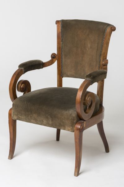Szögletes, lefelé elvékonyodó lábakon áll, a hátsók kifelé íveltek, az elülsők alsó végükön enyhén hajlottak. A párnázott, kifelé ívelő háttámlához csigás végződésű, S alakban hajló kartámlák csatlakoznak. Díszítményként valamennyi volután esztergályozott korongocska látható. Az ülőpárna kiemelhető.