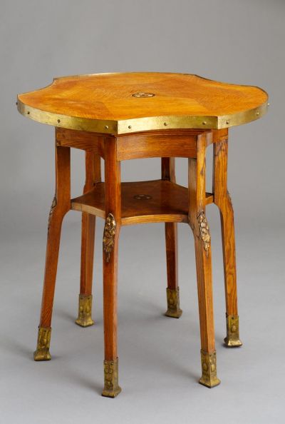 Fémpántban végződő, homorúan ívelt, szélein lecsapott, profilált és tagolt talapzaton áll a hat esztergált, leveles faragással díszített hengeres oszlop, amely az ovális asztallapot tartja. Az asztallap közepén három, körbe komponált szív motívumos berakás.