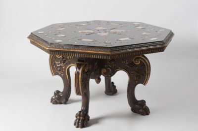 Az asztallap nyolcszögletű fekete márvány. Középen lapislazuli és körte idomú achátberakás. Az asztal nyolcszögletű lapjának megfelelően, a szimmetrikusan elhelyezett berakások nyolcszor ismétlődnek: az achátcsoport fajtáiból - carneol, calcedon, ametisztgyökér, s más achátok - apró, ovális foglalatba helyezett kövek körte alakú fűzért alkotnak. A fűzéreken