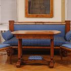 Az asztalból, kanapéból, két karosszékből és négy támlásszékből álló szalongarnitúra egykori tulajdonosainak tudomása szerint a Marczibányi család pesti palotájának hajdani berendezéséből származik. A meghitt kényelmet kedvelő biedermeier korszak lényegét jeleníti meg a tágas és világos nappaliban kialakított kedélyes ülősarok, amely a családias hangulatú társasági összejövetelek legfőbb színtere lehetett. Az ülősarok talán legfontosabb eleme a hosszúkás, akár két vagy három személy részére is helyet biztosító, szükség esetén étkezéshez is megfelelő magasságú kanapé. Előtte állt a garnitúrához tartozó, kerek vagy szögletes formájú asztal. Magyarországon – miként ebben az esetben is – inkább a szögletes, sarkain, illetve két végén kissé lekerekített asztalokat kedvelték, amelyeknek kávájában többnyire egy fiók is helyet kapott. A könnyen mozgatható és variálható elrendezésű, enyhén ívelő vékony lábakkal és változatos formájú háttámlával kialakított székek ülőlapjait általában kárpitozták vagy fakeretbe foglalt nádfonattal látták el.
