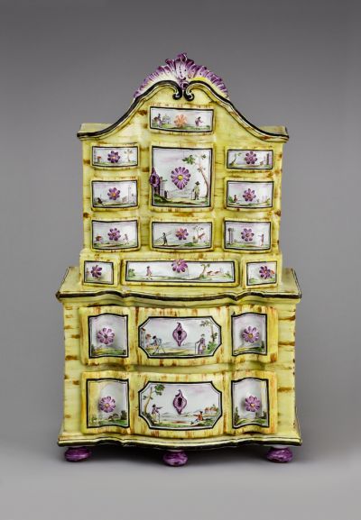 A magyar fajanszgyűjtemény ritkasága kicsinyített mása egy augsburgi eredetű, majd osztrák és magyar területen is igen elterjedt írószekrény-típusnak. A dísztárgy arányaiban pontosan követi a bútort, a szélesebb két fiókos alsó, és a sokfiókos felső részt egy – eredeti formájában lehajtható írólappal ellátott – alacsony, zömök elem köti össze, a sík oldallapok és lendületesen ívelt homloklapokkal készült, tört ívű, csigavonalas zárópárkányát rocaille-os dísz koronázza. Technikai bravúr, hogy a szekrényke tizennégy fiókja kihúzható. A dísztárgy festése faerezetet imitál, a fiókokon és az oldallapokon huszonkét különféle, fehér alapon színesen festett miniatűr tájképecske látható.