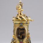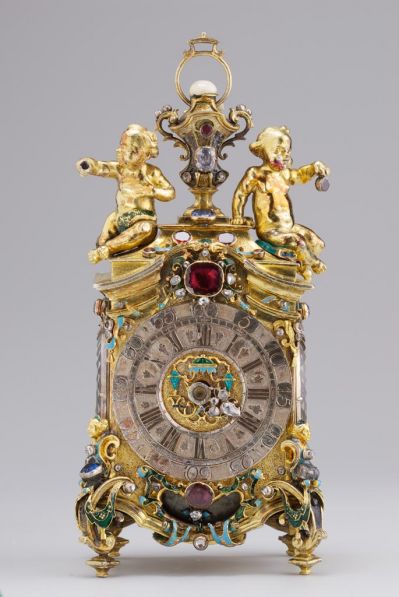 Volutaparokból kialakított négy lábon álló, hasáb alakú óraház, oromzatán rokokó díszváza és két ülő puttó öntött plasztikus figurája. A két, bronzból öntött, aranyozott ülő puttófigura eredetileg egy-egy attribútumot tartott kezében. Ezek utóbb elkallódtak, így csak feltételezni tudjuk, hogy a mulandóság és az örökkévalóság jelképei lehettek. A megmunkálásban és díszítményeiben a rokokó ékszerekre emlékeztető, kecses darabot a csiszolt, befoglalt drágakövek – gyémánt, zafír, almandin, smaragd és aquamarin – nagy száma és változatossága teszi kiemelkedően értékessé.