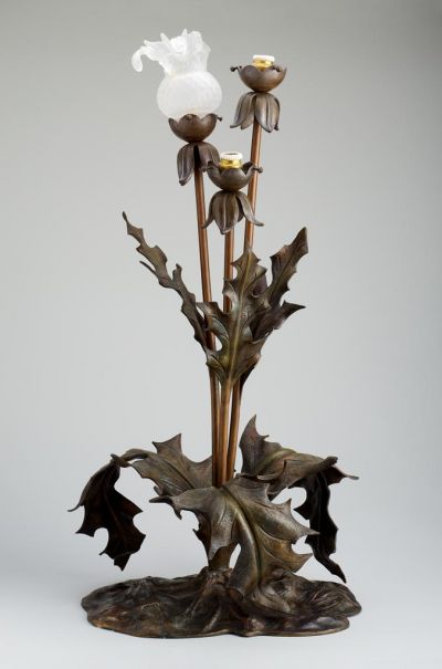 A naturalisztikusan megformált lámpa bogáncstövet utánoz. Szabálytalan talapzatból, három visszahajló, nagy levél közül kinövő három különböző hosszúságú szár. A leveles szárak végén csészeleveles foglalatban egy-egy, bogáncsvirághoz hasonló, felül nyitott üvegbura.