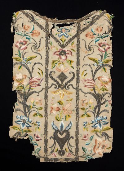 Technika: | mintásan letűzött fémfonalas hímzés; tűfestéses technikával hímzett |
