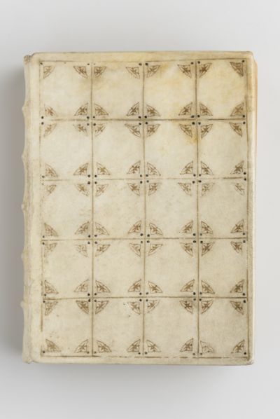 A fehér pergamenkötés előtáblájának felületét vízszintesen négy, függőlegesen öt aranyozott lénia osztja négyzetekre, melyek sarkaiban háromszög alakú levél és fekete pont alkotja a díszítést. A könyvtábla belső pereme kettős aranyozott lénia-kerettel és a sarkokban levéllel díszített. Gerincét öt borda hat mezőre osztja. A második mezőben a szerző neve és a mű címe aranyozott betűkkel, a többiben négy levélből összeállított kitöltő dísz. Előzéke kézi festésű, szürkés keményítős papír, elszórt, elmosódó körös díszítményekkel. Az előtábla tükrén beragasztva Jaschik saját tervezésű ex librise. Metszése díszítetlen.