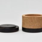 Henger alakú doboz fekete fatalppal és fedéllel. Az OPTEAM tervezőcsoport PARASET készletének egyik darabja.