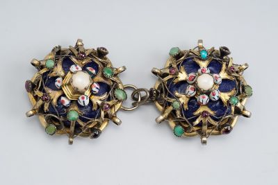 Mindkét darab azonos kiképzésű: hatkaréjos idomú alaplemezen kékzománcos korong, amelyre hat, leveles pánt borul. Közepén hat, felhajló, zománcos levélke között hatoldalú foglalatban türkizkő, a többi ékkő elszórtan helyezkedik el.