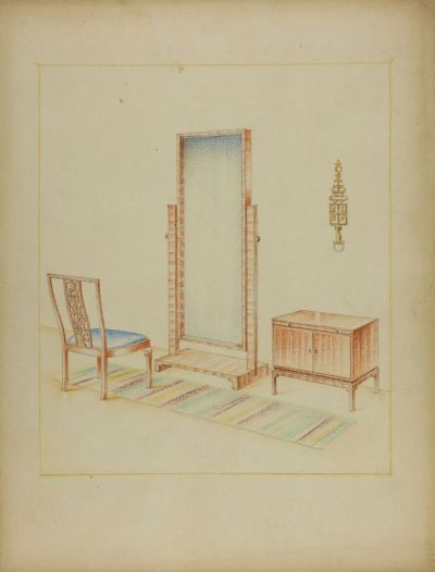 Bútorterv - előszoba álló tükörrel, kis szekrénnyel, hátasszékkel