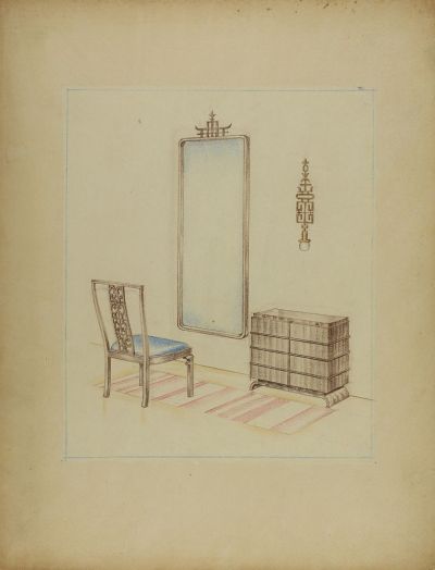 Bútorterv - szék, nagy fali tükörrel és komóddal