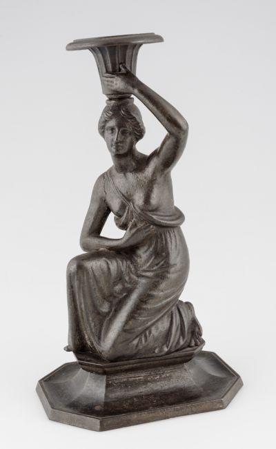 A Munkácson öntött gyertyatartók közül a leggyakrabban előforduló típus. Két variánsa ismert, a talapzat és a térdelő női figura megformálásában mutatkozik eltérés közöttük. Nyolcoldalú talapzaton figurális ábrázolás: féltérdre ereszkedett nőalak, lepelszerű öltözékben, fedetlen felsőtesttel. Jobb kezével lábára támaszkodik, baljával a fején lévő peremes gyertyacsészét fogja.