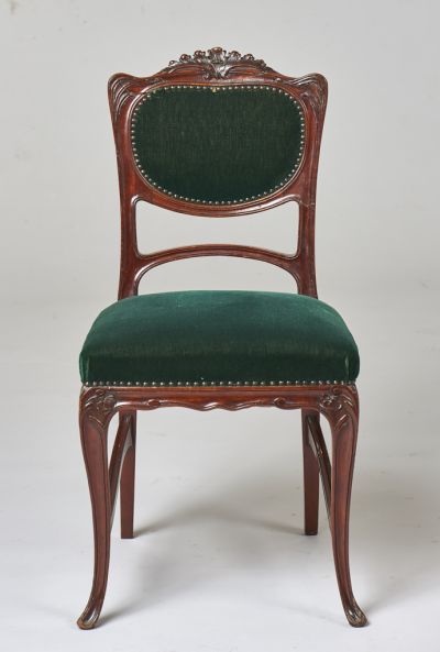A szék elöl faragott, hátul dísztelen, ívelt négy lábon áll. Keskeny kávája faragott peremű. Enyhén trapéz alakú ülése kárpitozott. A háttámla a hátsó lábakkal egybeépített, alsó részében egy íves összekötővel megerősített. Felső részén faragott keretelésű kárpitozott háttámasz. Újabb, zöld bársonyhuzattal bevont.
