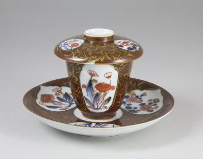 Csokoládés csésze fedéllel és aljjal - Virágos díszítőmezőkkel (Erős Ágost szász választófejedelem és lengyel király gyűjteményéből, No. 32 jelzetekkel és nyíllal)