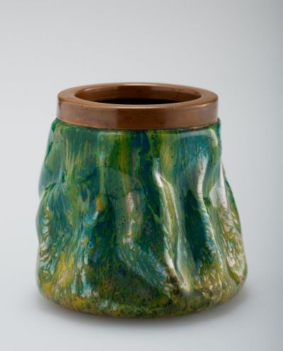 Felfelé enyhén összeszűkülő hengeralak, szájpereme rézgyűrűvel borított. Gyűrött hatású, szabálytalanul barázdált felületét zománc borítja, színei: zöldes, sárgás. Asztali dohányzókészlet darabja lehetett, feltehetően a legtöbb kiállított Rapoport-edényhez hasonlóan szerepelt az 1902. évi torinói nemzetközi kiállításon. Színvariánsa az Iparművészeti Múzeum 96.94 ltsz. tárgya.
