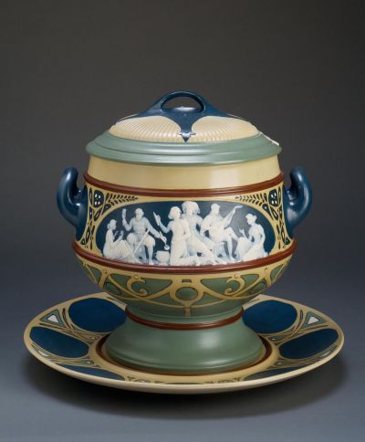 Az alátét tál tükre enyhén homorú, a ráhelyezendő edény kerületénél kissé szélesebb. A tál széles pereme homorúan emelkedik, rajta bekarcolt vonalakkal keretelt nyolc körlapból és stilizált levélvirág motívumból alkotott geometrikus minta. Az alapszín zöldessárga, a körlapok színe „berlini kék”, a köztes minta tompa zöld és fehér. A kiemelkedő perem barna, a kontúrvonalak feketék. A bólés-edény kerek, íves talpon áll, amely fölött a test három részre tagolódik, barna plasztikus csíkokkal elválasztva. Alsó, gömbölyű részen fekete vonalakkal keretelt kidomborodó, sárgászöld színű, négyszer ismétlődő, körökből, ívekből álló ornamentika. Alapszíne a talphoz hasonlóan tompa zöld. A középső, befelé szűkülő hengeres rész a legdíszesebb. A vaskos, felhajló ívű fülek síkjában, geometrikus, stilizált növényi minta között, lapos félkörívben finom, aprólékos domborműves jelenet látható, az edény mindkét oldalán. A kamea-vésést utánozó, angol „parian-ware” technikához hasonló, tompakék alapon megjelenő fehér porcelán (phanolith) domborművek stílusa historizáló. Feltehetően Jean Baptiste Stahl (1860-1932) műve, bár nem jelzett. Egyik oldalon mulató, hattagú társaság, egy férfialak széken ülve éppen egy hasonló edényből merít italt, társa mandolinon játszik. A másik oldalon hétalakos kompozíció, hordón ülő Bacchust köszöntenek dudaszóval, kosárban visznek nagy palackot. Az alakok öltözete a 17. századot idézi. A bólés edény felső része sima, tompazöld. A fedélen geometrikus minta, zöldessárga sugaras bordázat felett négyágú, kék színű pánt találkozásánál kerek bemélyedés, felette egyszerű, íves fogó. (A technikára és alkotóra vonatkozó információkat lásd: Fy-Halle 1985, 17.)