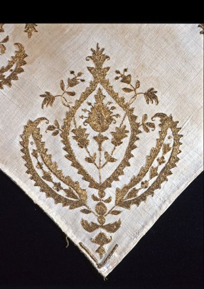 Fehér len- és pamutvászon, aranyozott ezüstfonalas hímzés­ sel.