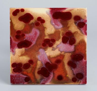 A négyzetes felületen gazdag amorf mintázat. Mélyvörös, szabálytalan oválisok csoportjai között elfolyó barna és sárga, szürkés-lila mázak puha foltjai. A finom reflexeket vető átlátszó eozinréteg halvány piros színe egységbe fogja a pompázó színeket.
