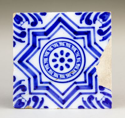 Technika: | fehér ónmázzal fedett; formába préselt; kobaltoxiddal festett |