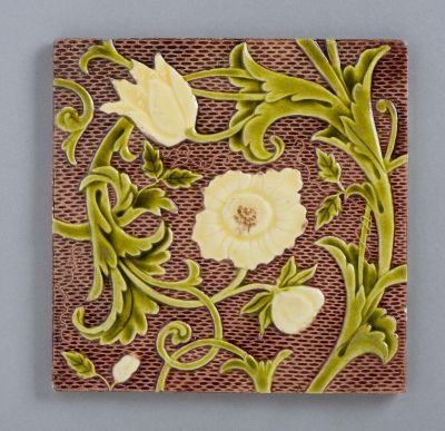 Falfelület borítására szolgáló, négyzetes csempék. A minta a csipkeszerű, apró vízszintes bemélyedésekkel díszített alapból domborművesen emelkedik ki. A két csempe csak színezésben tér el egymástól. Leveles virágos növény szára kanyarodik aszimmetrikusan, a különböző elágazások a szomszédos csempéken folytatódhattak. A háttér lila, a növény zöld, a kinyílt virág és a három bimbó sárga, illetve a másik csempén a háttér zöld, a minta világosbarna. (A kételemes minta folytatását lásd: 51.430 és 51.433 leltári számú tárgyak.)