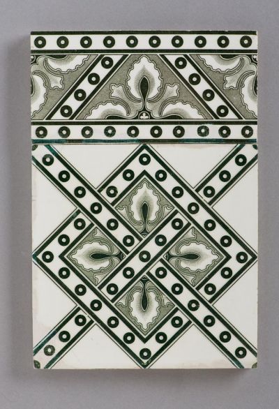 A négyzetes csempe falmező burkolására, a téglalap alakú annak szegélyezésére szolgált. Bár egy színnel nyomták, a belső rajzolatok különböző sűrűségű raszterhálója miatt a mintázat árnyalt grafika benyomását kelti. Két csík közötti karikák díszítik az átlósan futó fehér szalagokat, amelyek egymásba bújtatott kisebb és nagyobb négyzeteket rajzoltak ki a végtelenített csempék kirakásakor. A kisebb négyzetek belsejében stilizált levelek.