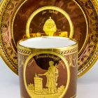 | Jelzés: | a csésze alján masszába nyomva: 22 / 39; máz alatt kobalttal festve: bécsi pajzsjegy; a csészealj alján masszába nyomva: 21 / 39; máz alatt kobalttal fetsve: bécsi pajzsjegy / Nz, arannyal festve: 38 (?) |