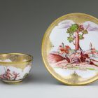 | Jelzés: | a csésze alján masszába karcolva: 66; a csészealj alján: 63; mindkettő alján máz alatt kobalttal festve: keresztbe tett két kard |