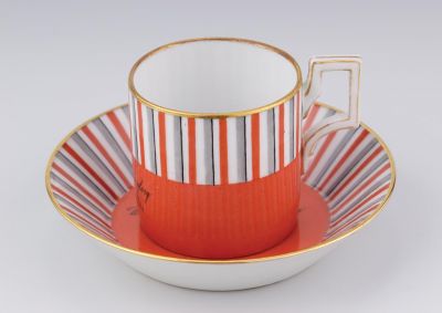 Feltételezhető, hogy a koraklasszicista eredetű, ún. gobelet litron hengeres formát és a jellegzetes, szögletes fület formázó csésze és a hozzá tartozó csészealj is egyedi megrendelésre készült. Ugyanis ez a típus kevéssé ismert a herendi forma- és mintakincsben. A csésze testének felét és a csészealj öblét narancsos piros színű fond, azaz egyenletes alapfestés fedi, ezt élénkíti a narancs, fehér, szürke és fekete, függőleges csíkokból álló minta, ami körbefut a csésze felső részén és a csészealj belső peremén. Az art deco stílusában készült, elegáns díszítés csavarját a tárgyakon olvasható, feketével, kézzel írt feliratok adják. A csészén: Man for his glory / To history flies; a csészealj felirata: While womans (sic!) bright story / Is told by her eyes. (Szabad fordításban: A férfiak dicsősége a történelemmel száll; A nők fényes történeteit a szemük meséli el.)