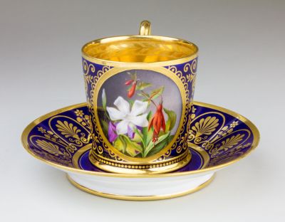 | Jelzés: | csésze: alján, a masszába karcolva: H; P; máz felett kobaltkékkel pecsételve: két egymásba kapcsolódó L betű, amelyek anjou liliomot és / 'Sevres' feliratot zárnak közre; csészealj: a masszába karcolva: SD; háromnegyed körív; függőleges vonal; Z |