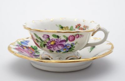 Jelzés: | csésze: alján, kettős keretelésű, fekvő ovális keretben, máz felett lilával pecsételve: Meißen; csészealj: alján, a masszába pecsételve: MEISSEN; kettős keretelésű, fekvő ovális keretben, máz felett lilával pecsételve: Meißen |
