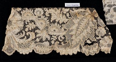 Az itt bemutatott Argentan csipke mustrája hatszögű hálós alapon hatalmas, csipkézett szélű levélből, kisebb virágokból és levelekből áll. Az egyes motívumokat huroköltéses, kidomborodó körvonal keretezi. Az egykor kézelőt díszítő csipke báró Hatvany Józsefné ajándékaként került gyűjteményünkbe, akik gróf Ferry Lipótnéval együtt gazdag adományukkal megalapozták az Iparművészeti Múzeum korai olasz, francia és flamand csipkegyűjteményét.