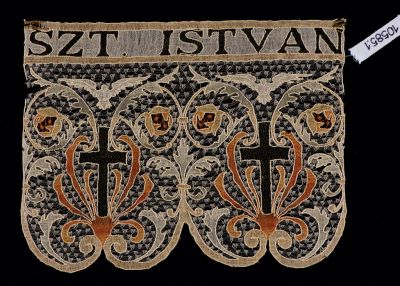 A csipke fölső, egyenes szélén SZT. ISTVÁN felirat. Alatta a szimmetrikus minta kétszer ismétlődik: ívesen behajló levelek között fémfonalas kereszt, melynek vízszintes szárai felett csigavonalszerűen hajló szárak végén egy-egy rózsabimbó. A kereszt fölött a galamb képében megjelenő Szentlélek. Valószínűleg oltárterítő szegélyére szánták, ennek kivitelezéséről azonban nincs tudomásunk.