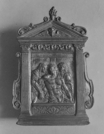 Oszloppárral övezett, maszkos, oromdíszes lezárású keretben háromalakos domborműves ábrázolás – a halott Krisztus Máriával és János evangélistával – a padovai Moderno kompozíciója nyomán (Ld.: Bange, E. F.: Reliefs und Plaketten. Berlin, 1922. Nr. 455.). A talapzat vésett majuszkulás felirata – PIETAS AD OMNIA – bibliai eredetű, a Róm. 5.18. sommázata.