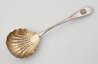 A merítő külön ráforrasztott, belül aranyozott, bordázott, karéjos szélű, felületén mintásan áttört.
