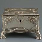 Téglatest alakú doboz, ívelt vonalú kihajló lábakkal, kissé hullámos oldalakkal, felhajtható fedéllel. Testén szívformájú üres kartuspajzsok körül indás, bimbós, virágos stilizált díszítmény, fedelén az ovális pajzsot hasonló, nagyobb léptékű mustra övezi.
