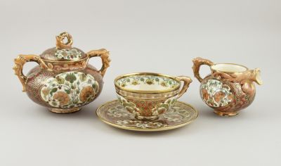 A csészéken és csészealjakon három, a kannákon kétkaréjos medalionban, fehér alapon stilizált virágtő, két szegfű, két tulipán és egy gránátalma-virág, szimmetrikus elhelyezésben, zöld, sárgásbarna és pink színekkel a közbülső mezőkön pink és zöldes mázzal arabeszkek. A stilizált delfinek sárgás pink színnel, a kontúrvonalak, a sárkányok arannyal festettek.