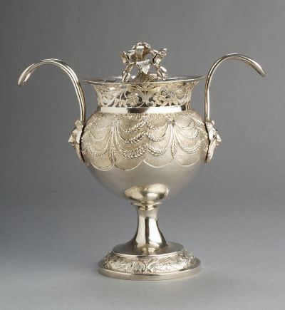 Kerek tagolt talpán poncolt sávon trébelt levéldísz, fölötte sima kónusz. Ezen áll a félgömb alakú, erősen kihajló szájperemű test. Felső részén széles frízben poncolt alapú hármas búzakalászból álló girland. Szájpereme áttört, fedele plasztikus virágcsokorral díszített. Két füle hurokszerűen hajlított, alján egy-egy faunfej applikálva.