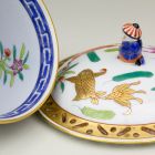 | Technika: | áttört fedél; máz felett aranyozott; máz felett színesen festett; negatív forma felhasználásával készült; öntött és mintázott elemekkel |